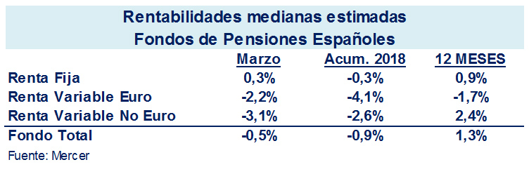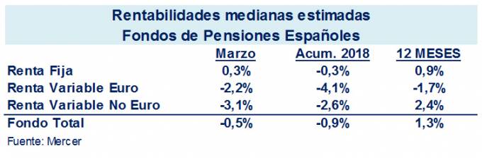 Los Fondos de Pensiones de empleo españoles acabaron marzo con una rentabilidad mediana del -0,5%, según los datos de Mercer. El resultado se debe al comportamiento negativo experimentado por la renta variable. La renta variable no euro obtuvo una rentabilidad del -3,1%; la renta variable euro del -2,2%, y la renta fija del 0,3%, siendo la única clase de activo con comportamiento positivo durante el mes.
