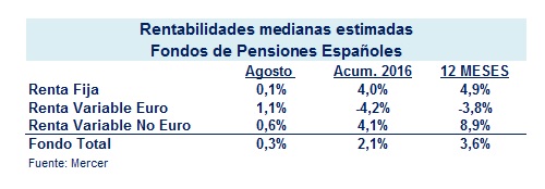 Los Fondos de Pensiones de Empleo han obtenido en agosto una rentabilidad del 0,3% según el Servicio de Medición de Fondos de Pensiones PIPS de Mercer, siendo la renta variable euro la que ha obtenido mayor revalorización. En los últimos meses del año se llega a una rentabilidad del 3,6%.