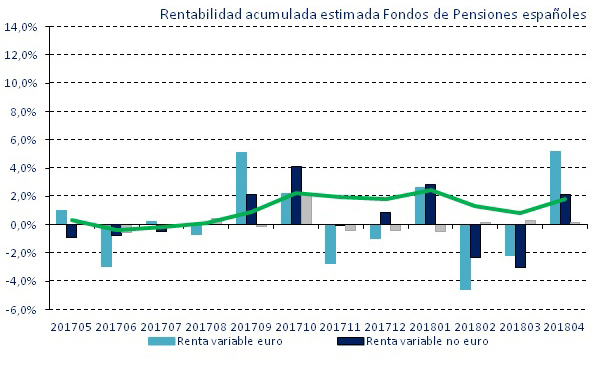 La rentabilidad mediana estimada del mes de abril de los Fondos de Pensiones españoles de empleo fue del 1%, según los datos del Servicio de Medición de Fondos de Pensiones PIPS (Pension Investment Performance Service) de Mercer. El dato de rentabilidad responde al comportamiento positivo experimentado por la renta variable euro, con un rendimiento del 5,21%. La renta variable no euro obtuvo una rentabilidad de 2,1%, mientras que la de la renta fija fue del 0,1%, siendo la clase de activo con el peor comportamiento durante el mes.