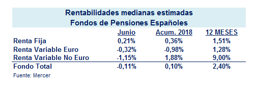 Los Fondos de Pensiones españoles durante el pasado mes de junio tuvieron una rentabilidad mediana estimada de -0,11%, según el Servicio de Medición de Fondos de Pensiones PIPS (Pension Investment Performance Service) de Mercer.