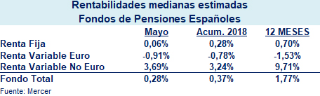 Los Fondos de Pensiones españoles han obtenido en mayo una rentabilidad mediana del 0,28% debido al comportamiento positivo de la renta variable no euro (3,69%), que compensa el estancamiento de la renta fija (0,06%) y la caída de la renta variable euro (-0,91%). Son estimaciones facilitadas por el Servicio de Medición de Fondos de Pensiones PIPS (Pension Investment Performance Service) de Mercer.