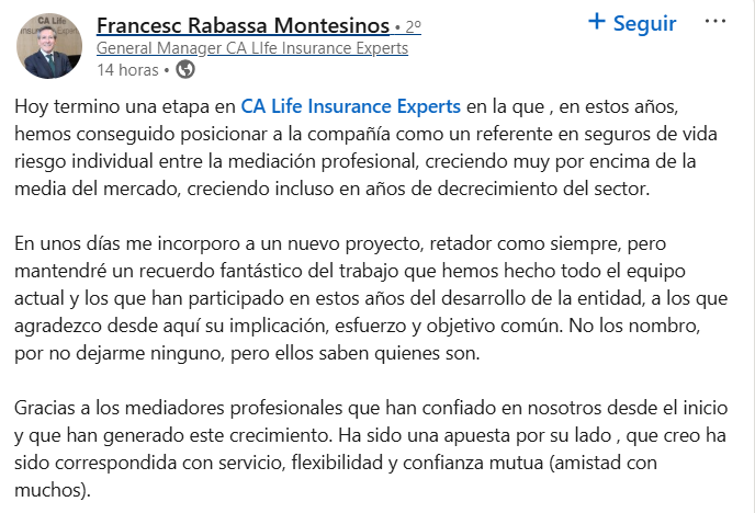 En la tarde de ayer Francesc Rabassa anunció en la red de LinkedIN que finalizaba su etapa como director general de CA Life Insurance Expert. Señala que "en unos días" se unirá a un "nuevo proyecto, retador como siempre".
