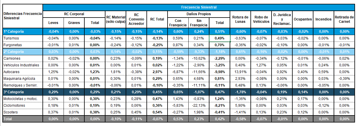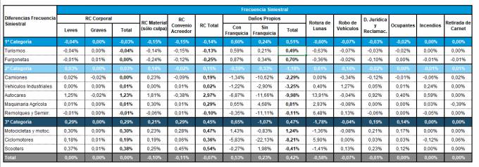 Los datos de la frecuencia siniestral del ramo de Automóviles confirman un aumento del 0,42% en Daños Propios al cierre del primer trimestre del año. Según ICEA, los daños propios con franquicia se incrementaron un 0,53% y sin franquicia, un 0,23%. En RC Corporal se registró una caída del 0,10% mientras en RC Total el descenso fue del 0,07%. En el resto de garantías apenas se observaron variaciones si se compara con el mismo trimestre del año pasado, salvo en rotura de lunas (-0,58%).