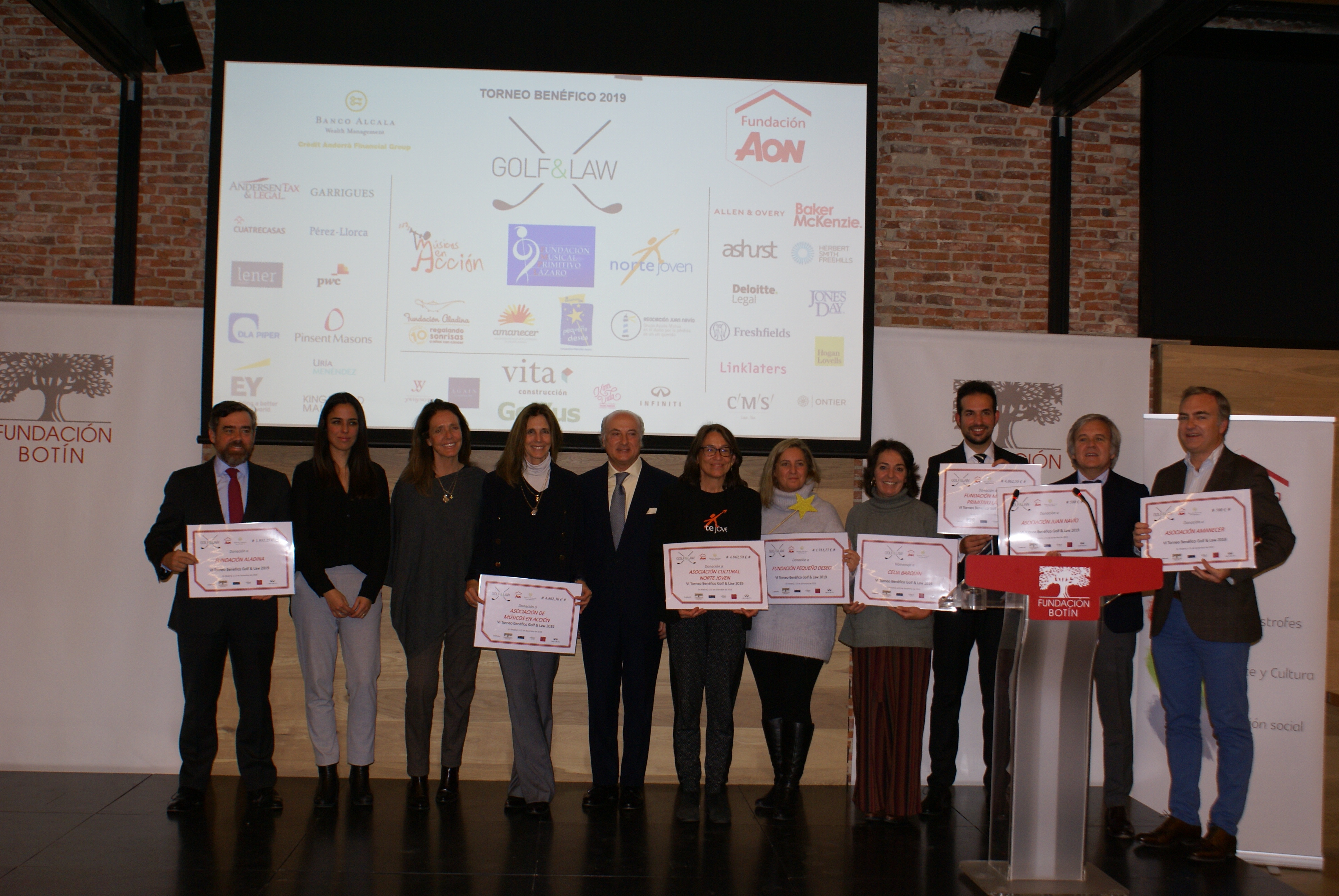Fundación Musical Primitivo Lázaro, la Asociación de Músicos en Acción, la Asociación Cultural Norte Joven, la Asociación Juan Navío, la Asociación Amanecer, la Fundación Pequeño Deseo y la Fundación Aladina han recibido las donaciones correspondientes al VI Torneo Benéfico Golf & Law, cuyos principales patrocinadores son la Fundación Aon España y el Banco Alcalá, en un acto celebrado en la Fundación Botín. Además, se ha rendido homenaje a la joven golfista cántabra Celia Barquín, asesinada el pasado año en un campo de golf en EEUU.