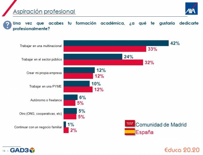 Fundación AXA ha presentado las conclusiones de una encuesta realizada a 12.000 estudiantes madrileños en la que se concluye que los estudiantes de 16 a 19 aspiran a trabajar en multinacionales o en su propia empresa.
