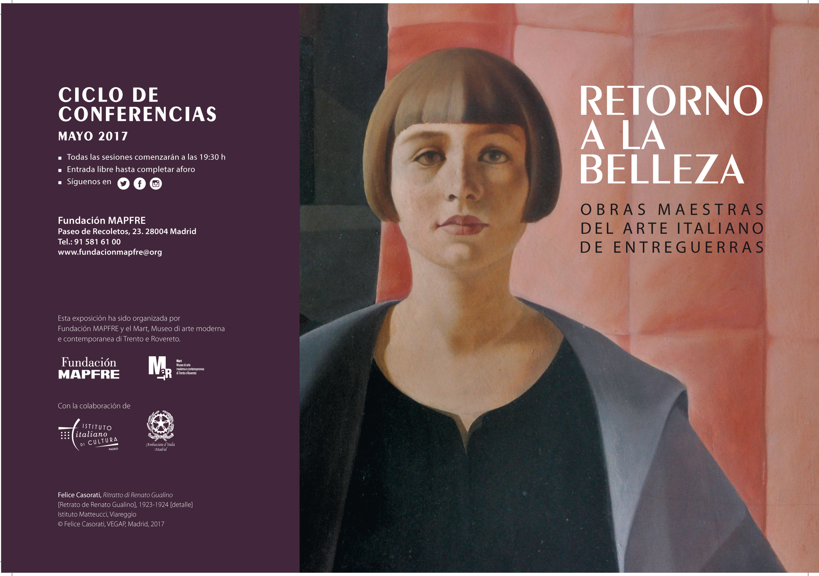 Fundación Mapfre ha organizado, con motivo de la exposición ‘Retorno a la belleza. Obras maestras del arte italiano de entreguerras’, un ciclo de conferencias que tendrá lugar del 8 al 11 de mayo en el auditorio de la fundación. Este ciclo, compuesto por 4 conferencias, analizará las claves de este periodo del arte italiano en el que los artistas, en las primeras décadas del siglo XX, iniciaron un movimiento de recuperación de los ideales clásicos como modelo para reconquistar un lugar y un tiempo dominados por los valores de la belleza y la armonía.