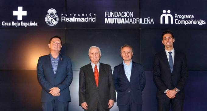 El director nacional de Captación, Alianzas con Empresas y Marketing de Cruz Roja, Jaime Gregori, el director general de la Fundación Mutua Madrileña, Lorenzo Cooklin, y el vicepresidente ejecutivo de la Fundación Real Madrid, Enrique Sánchez, acompañados por el embajador del Real Madrid, Álvaro Arbeloa, han firmado el acuerdo por el que arranca el Programa Compañer@s en el estadio Santiago Bernabéu.