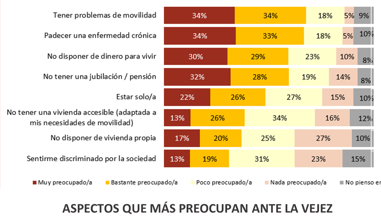 Otros resultados que deja el informe son que 1 de cada 3 españoles está muy o bastante preocupado por su vejez, aunque la mayoría (43%) se muestra poco o nada preocupada y un 11% ni siquiera piensa en ello. Es de destacar que los más jóvenes (18 a 24 años) y los más mayores (65 a 74 años) son los que muestran un grado de preocupación menor.