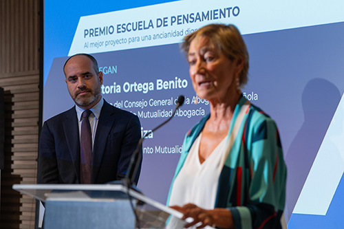 Finalmente el primer premio Escuela de Pensamiento al mejor proyecto para una ancianidad digna ha sido otorgado ex aequo a dos ganadores: al Ilustre Colegio de la Abogacía de Madrid por su proyecto "Conoce tus derechos y Club Senior", reconocimiento que recogió Lola Fernández Campillo, vocal del ICAM y a la Fundación Fernando Pombo por su proyecto "Envejecer con derechos, que la edad no sea un límite" que recogió Ana Higuera Garrido, Directora de la Fundación Fernando Pombo.