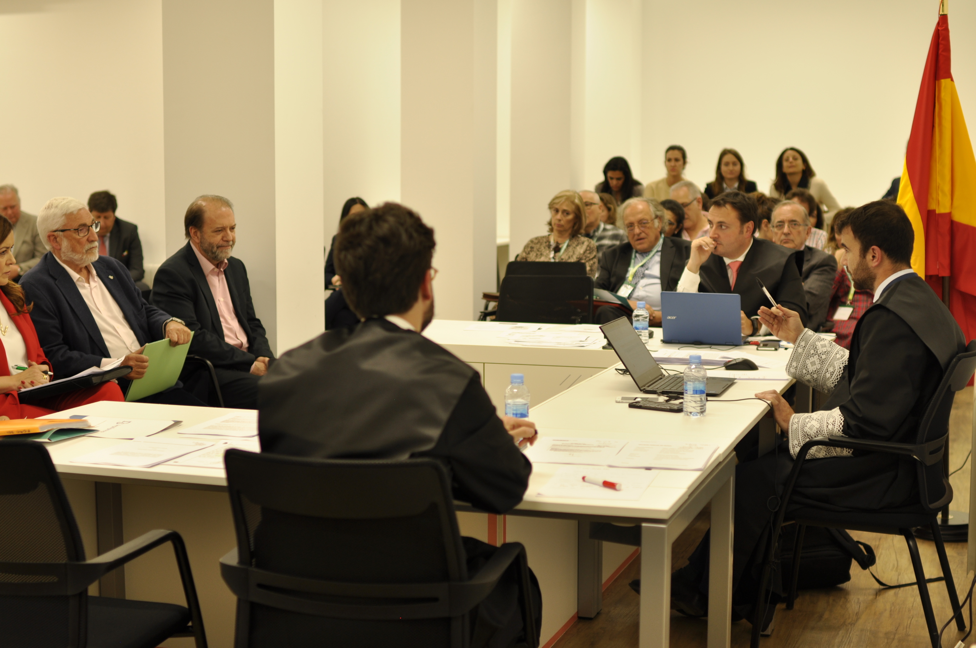 La clase práctica ha consistido en un juicio sobre un caso real, en la que han participado abogados profesores del Máster y peritos médicos, algunos de ellos exalumnos del propio posgrado. Con la escenografía propia de una sala de juzgado, los peritos han tenido que ratificar sus informes y someterse a las preguntas de abogados y juez, además de defender su postura como expertos frente al criterio de los demás peritos en un intenso careo.