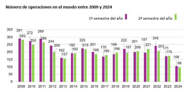 En 2024, a nivel mundial, se completaron un total de 204 fusiones y adquisiciones entre aseguradoras, 142 menos que en 2023, cuando se formalizaron 346. Así se revela en el informe 'Insurance Growth Report', elaborado por Clyde & Co. El despacho de abogados lleva 16 años publicando este estudio y confirma que estas 204 operaciones es la cifra más baja registrada en todo este tiempo. Argumenta que este tipo de operaciones han caído en 2024 debido a 3 factores: la persistencia de altos tipos de interés, la inestabilidad geopolítica y la creciente regulación del sector.