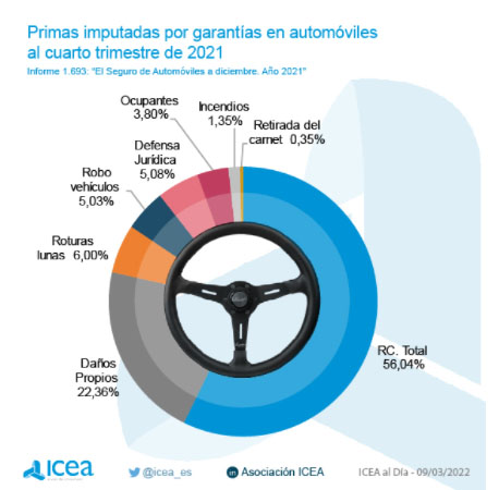 El ramo de Autos cuenta con una cuota de No Vida del 28,7%. ICEA analiza las garantías de este seguro en su informe 'El seguro de Automóviles. Estadística a diciembre. Año 2021' donde se destaca que la de RC Total es la más contratada y congrega hasta el 56% de las primas imputadas para el conjunto de vehículos; el porcentaje se eleva hasta el 74,6% si se observan los vehículos de 2ª categoría y algo menos (71%) para los de 3ª.