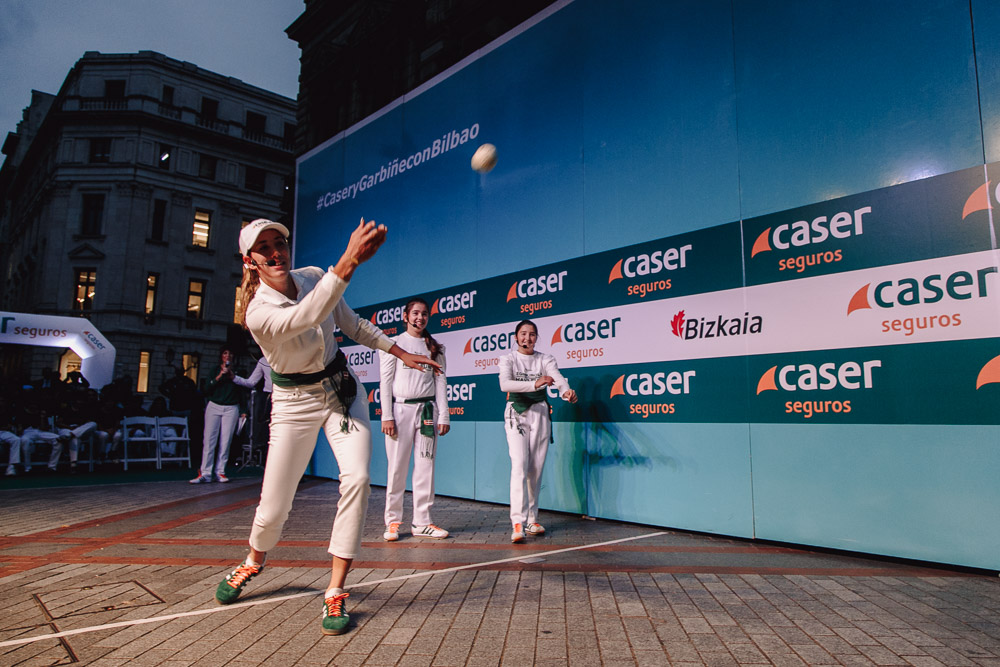 Garbiñe Muguruza se ha estrenado esta tarde en el juego de la pelota vasca en un evento organizado por Caser en la Gran Vía de Bilbao. La tenista se ha medido con dos jóvenes pelotaris del programa de Deporte Escolar de la Diputación de Bizkaia con el objetivo de impulsar la cultura y el deporte vasco entre los más jóvenes.