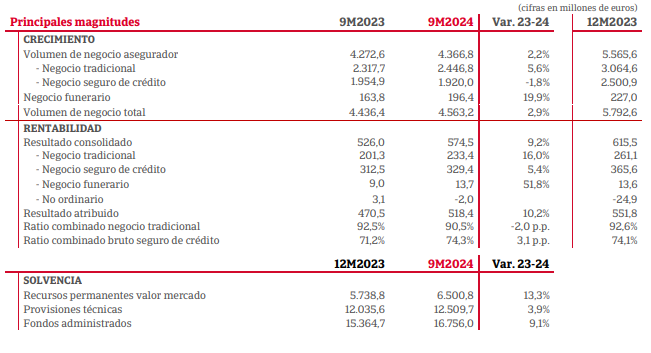 El ratio combinado del negocio tradicional ha mejorado 2 puntos, situándose en el 90,5%, principalmente por la buena evolución del ramo de Multirriesgos fruto del crecimiento de las primas y la mejora de gastos y siniestros ya que se ha tenido menos siniestralidad climatológica. En cuanto al ratio combinado del seguro de Crédito, ha alcanzado el 74,3%, 3,1 puntos por encima del registrado a cierre de septiembre del año anterior.
