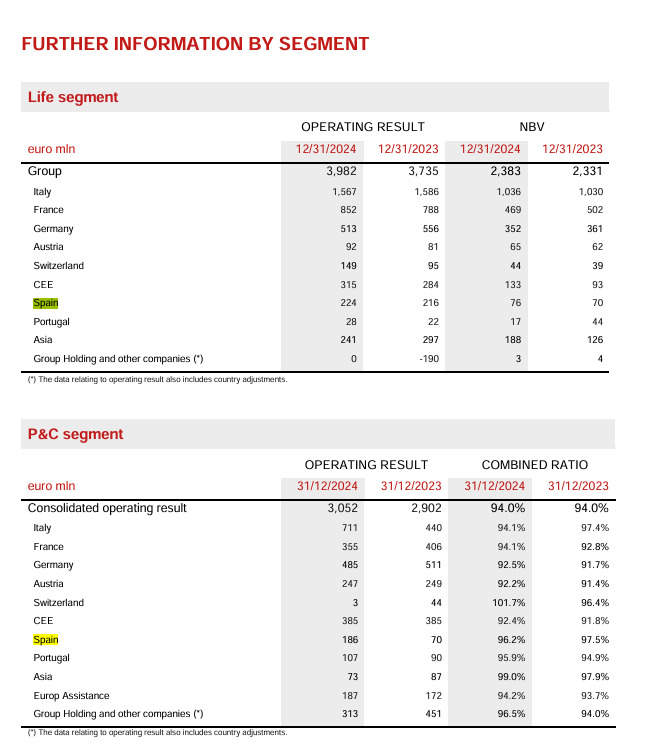 Aparece poca información en los datos facilitados sobre España, pero de los mismos se desprende que el ratio combinado del negocio No Vida ha mejorado al pasar del 97,5% el pasado año al 96,2% con el que ha cerrado 2024. Así, el resultado operativo