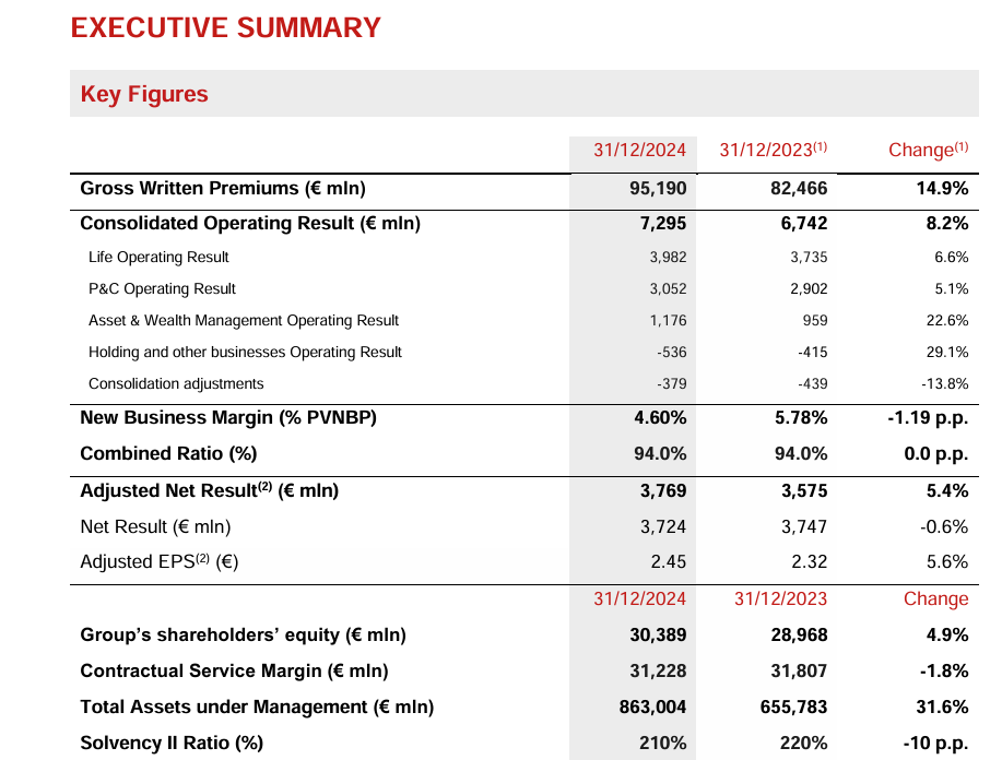 El CEO del grupo, Philippe Donnet, ha manifestado que la entidad "logró excelentes resultados en 2024, superando nuestros objetivos financieros y cerrando con éxito nuestro plan estratégico 'Lifetime Partner 24: Driving Growth'". Apunta que los resultados reflejan la capacidad para "asegurar un crecimiento orgánico constante en cada segmento a través de las acciones de gestión que implementamos, mientras integramos con éxito todas las empresas que hemos adquirido". Considera el directivo que hoy Grupo Generali "está en la posición más fuerte de su historia, demostrado por nuestros resultados operativos y netos ajustados récord, logrados gracias a los esfuerzos y el compromiso de nuestra gente y de la red de distribución".