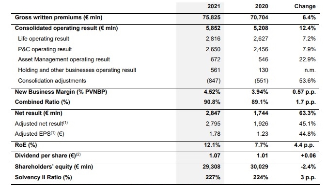 Grupo Generali ha obtenido un beneficio neto de 2.847 millones de euros en 2021, lo que significa un incremento del 63,3% respecto al ejercicio anterior, mientras que su volumen de primas ha aumentado un 6,4%, ascendiendo hasta los 75.825 millones. El ROE ha mejorado 4,4 puntos, situándose en el 12,1%, y el ratio combinado ha empeorado 1,7 puntos, siendo del 90,8%. El margen de solvencia se encuentra en el 227%.
