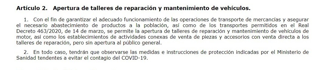 Es un documento breve, con solo 2 artículos y una disposición final única. Pero un artículo está dedicado exclusivamente a los talleres. En dicho precepto, el Ministerio establece que "se permite la apertura de talleres de reparación y mantenimiento de vehículos de motor" para "garantizar el adecuado funcionamiento de las operaciones de transporte de mercancías y asegurar el necesario abastecimiento de productos a la población". El Ministerio también permite la apertura de "los establecimientos de actividades conexas de venta de piezas y accesorios con venta directa a los talleres de reparación".