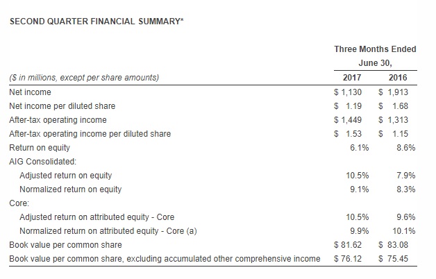 El Grupo AIG registró un beneficio neto de 1.130 millones de dólares (1,19 dólares por acción diluida), para el segundo trimestre de 2017, frente a los 1.910 millones de dólares (1,68 dólares por acción diluida) en el mismo trimestre de 2016.