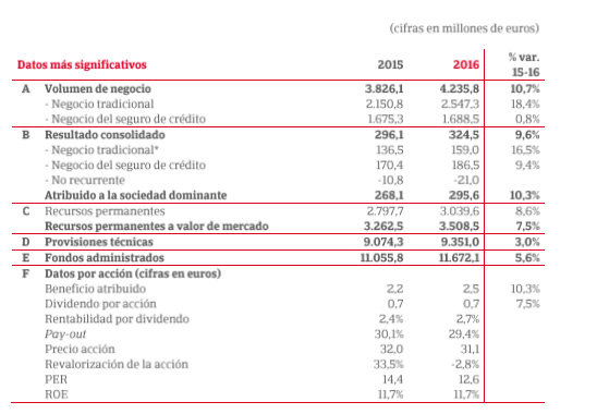 La solvencia se sitúa en el 200% y los recursos a valor de mercado han crecido un 7,5% hasta los 3.508,5 millones. Los fondos administrados alcanzaron los 11.672,1 millones (+5,6%). El consejo de administración espera aprobar un dividendo complementario de 7,5%, con lo que alcanzaría un pay-out del 29,4% sobre el resultado atribuible de 2016.