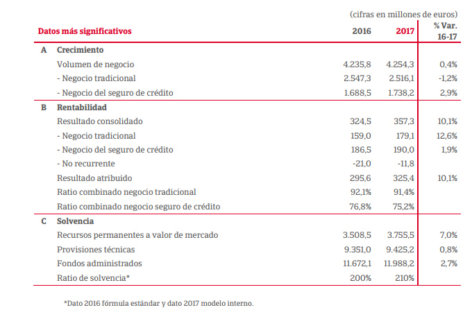 Grupo Catalana Occidente obtuvo en 2017 un beneficio consolidado de 357,3 millones de euros, lo que significa un incremento del 10,1% respecto al mismo periodo de un año antes. Ha aumentado su facturación y resultado tanto en el negocio tradicional como en la parte de Crédito. Así, su capital ha crecido un 7%, mientras que su ratio de solvencia se encuentra en el 210%. El volumen de negocio total alcanzó los 4.254,3 millones.