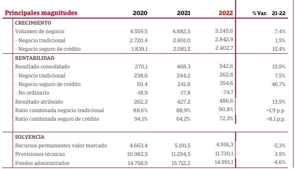 También ha avanzado en 2022 el volumen de negocio, que lo ha hecho un 7,4%, elevándose hasta los 5.245,6 millones. La directora general de Financiero y Riesgos de Grupo Catalana Occidente, ha calificado de "hito" este hecho de superar la barrera de los 5.000 millones en primas. De este total, 2.842,9 millones corresponden al negocio tradicional (+1,5%) y 2.402,7 millones al negocio del seguro de Crédito (+15,4%). Clara Gómez ha matizado que Crédito se ha beneficiado de un "aumento de la actividad comercial y del efecto de la inflación".