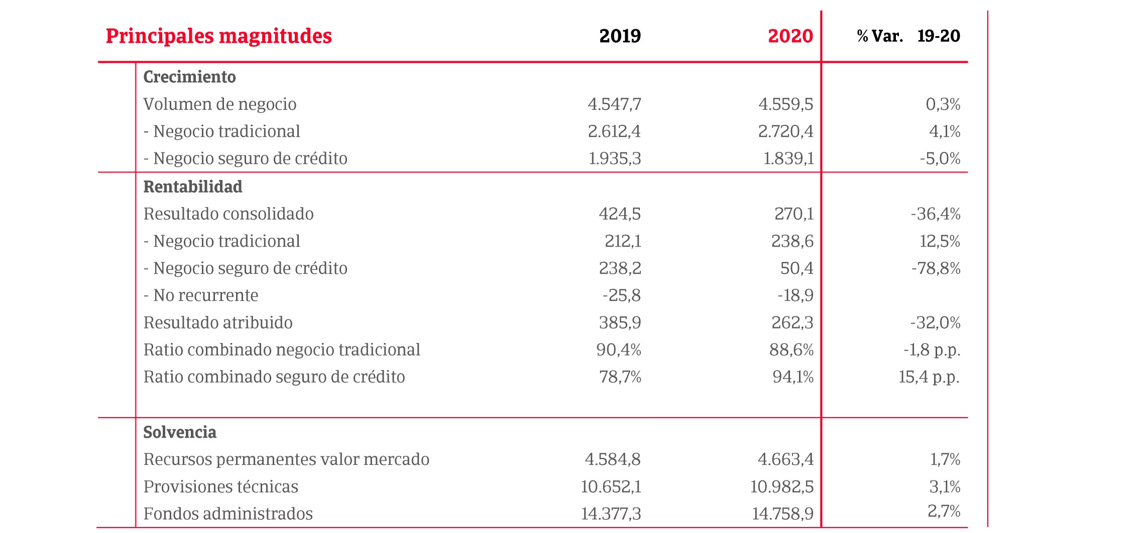 El director general del grupo, Francisco Arregui, ha indicado que la crisis por el actual virus afecta de manera diferente al negocio tradicional y al de Crédito y señala que "la positiva evolución del negocio tradicional ha compensado parcialmente la disminución del resultado del seguro de crédito". Considera el directivo que el grupo "ha conseguido mitigar el impacto con medidas selectivas de gestión de riesgos y un adecuado nivel de provisionamiento en el negocio del seguro de crédito".