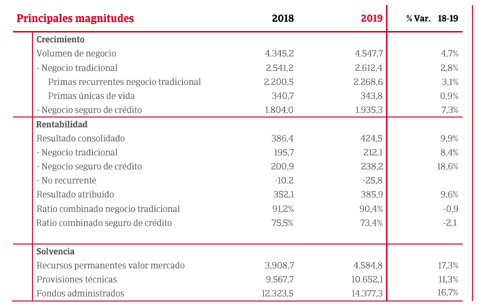 Asimismo, el Grupo ha facturado 4.547,7 millones de euros en 2019, lo que supone un crecimiento del 4,7%. El negocio de seguro de Crédito ha contribuido con 1.935,3 millones (+7,3%) y el negocio tradicional con 2.612,4 millones (+2,8%). Desglosada esta última partida, 2.268,6 millones son primas recurrentes (+3,1%), destacando la facturación de Multirriesgos; y 343,8 millones, primas únicas de Vida (+0,9%). Si bien, el negocio de vida en su conjunto ha crecido un 5,3%. Por otro lado, Antares ha obtenido un resultado recurrente de 11,9 millones.