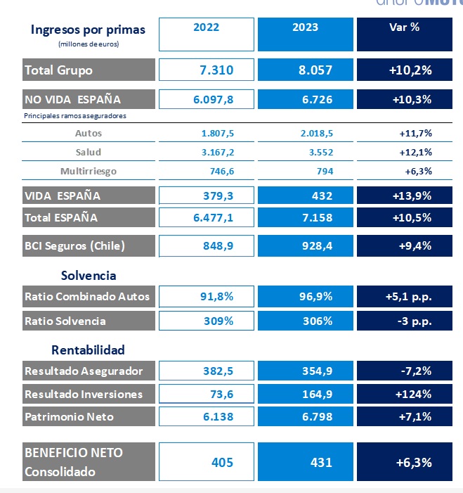 La actividad del Grupo en No Vida mantiene la senda del crecimiento de los últimos 10 años con unos ingresos por primas en este ejercicio de 6.726 millones de euros (un 10,3% más). En Autos, concretamente, "actividad principal de la casa", los ingresos llegaron a los 2.018.5 millones, un 11,7% más, "doblando a la competencia".