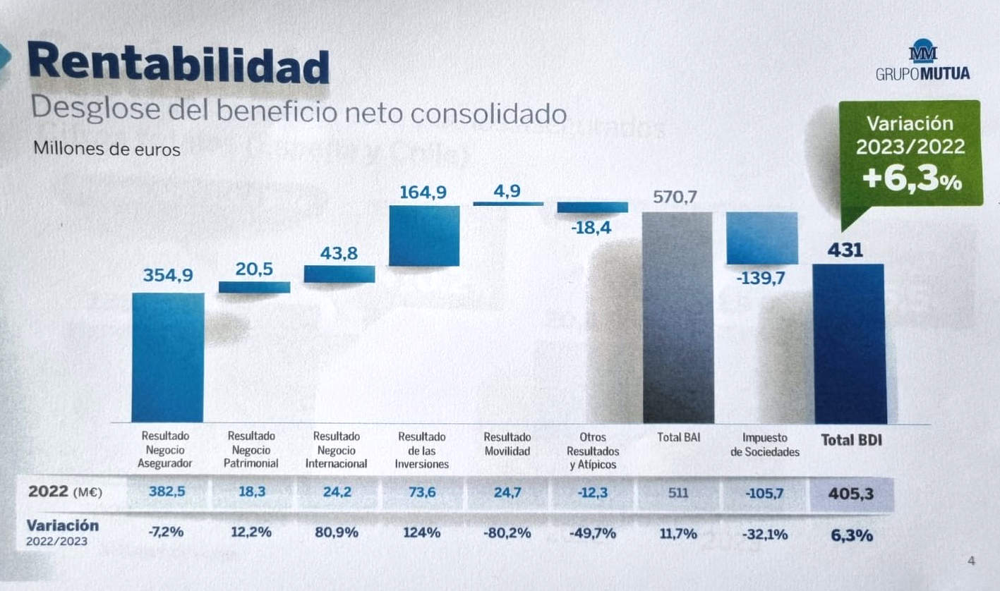 Grupo Mutua ha ganado 431 millones de euros a cierre de 2023, lo que supone un 6,3% más que en el ejercicio anterior, a pesar de que el negocio propiamente asegurador ha experimentado un retroceso del 7,2% y obtuvo un beneficio concreto de 354,9 millones de euros muy impactado por el aumento de los costes, según los datos presentados por la compañía.