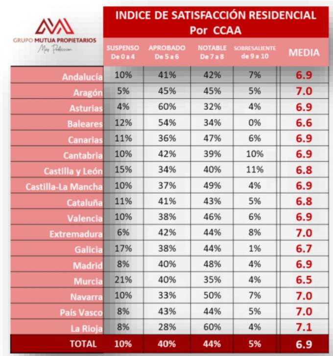 Grupo Mutua de Propietarios ha puesto en marcha el 'Índice de Satisfacción Residencial'. Para calcular este índice, la aseguradora ha analizado 3 variables que influyen en su valoración entre más de 2.300 españoles: la satisfacción con la propia vivienda, con los vecinos y con la zona de residencia.