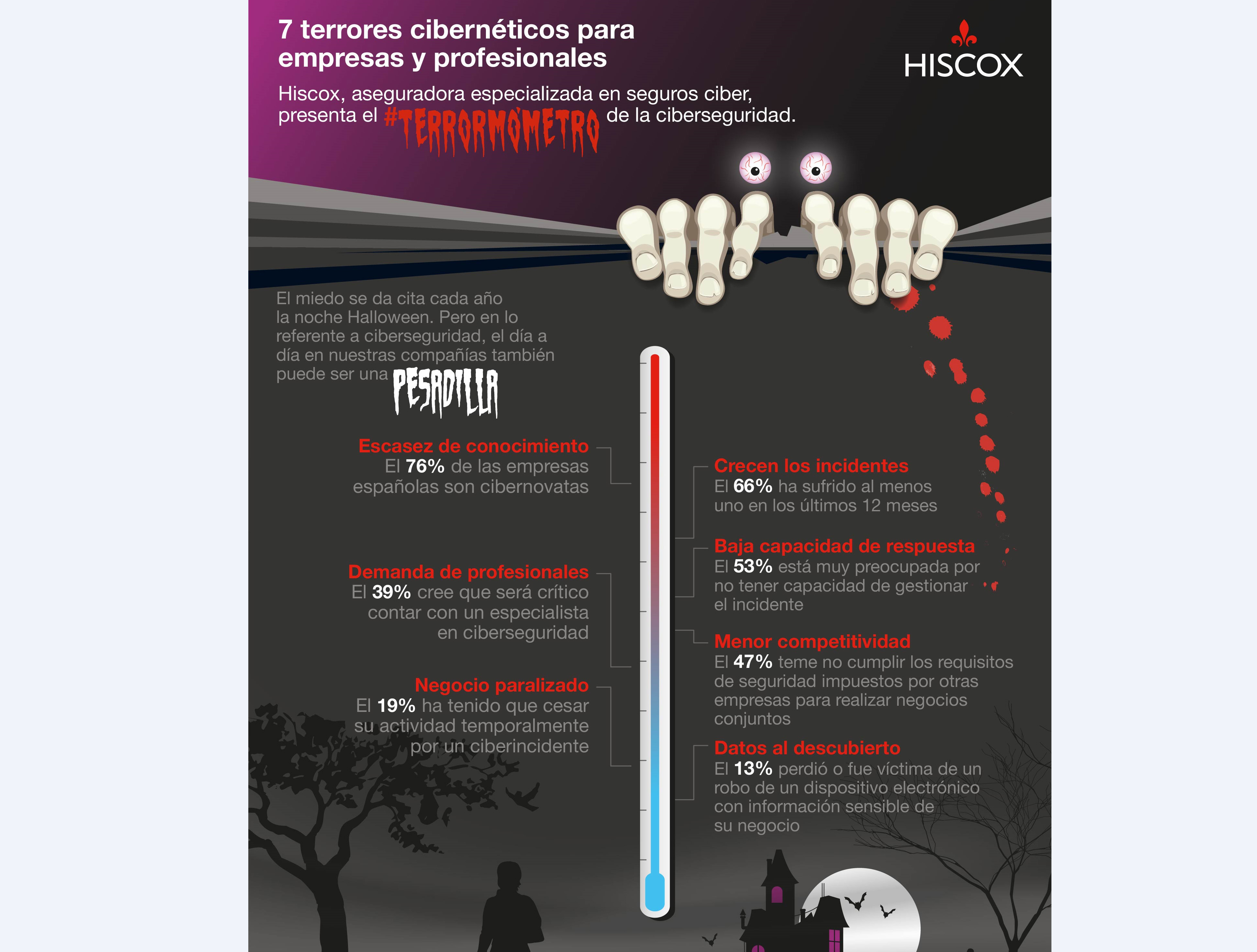 En concreto, Hiscox ha elaborado una infografía (adjuntada en esta noticia) en la que propone un termómetro que asciende poco a poco sobre los datos que considera más preocupantes. Por ejemplo, incluye desde el miedo a perder un dispositivo electrónico dejando al descubierto información sensible de la compañía, proveedores o clientes –algo que le sucedió al 13% de las compañías encuestadas– al temor del 47% de los entrevistados de ver reducida su competitividad al no poder cumplir con los requisitos de ciberseguridad que exigen otras compañías para colaborar o el hecho de que, según el propio informe, el 76% de las empresas y profesionales españoles analizados no superan la calificación de 'cibernovatos'. Negocios paralizados, demanda de profesionales, baja capacidad de respuesta o aumento del número de incidentes cibernéticos completan el #Terrormómetro.