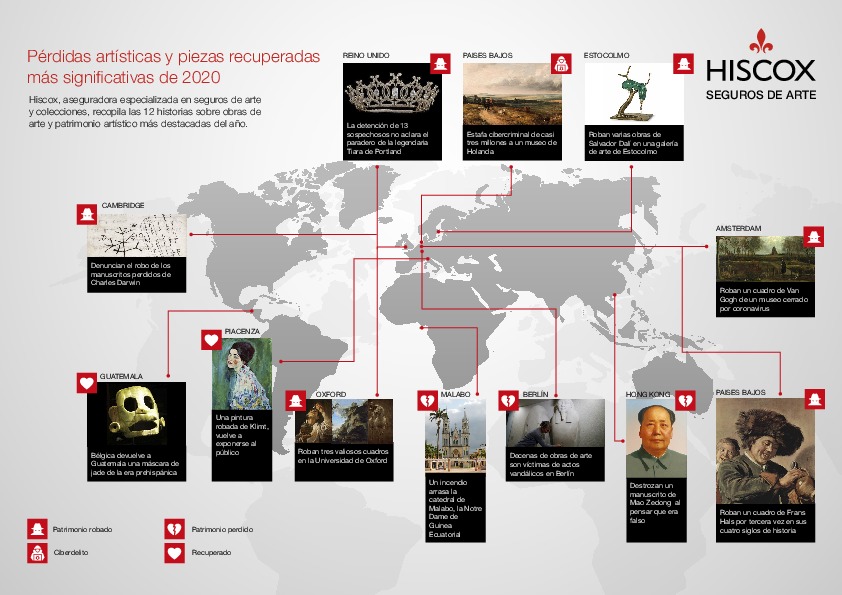 La responsable del área de Arte y Clientes Privados de la compañía, Eva Peribáñez, apunta que de esta manera han querido recopilar las historias más destacadas de un año "donde el Covid-19 también ha condicionado alguno de los siniestros". En este sentido menciona robos en museos cerrados por el confinamiento. Hiscox también quiere mostrar que "siempre hay noticias positivas que se logran gracias al esfuerzo y al trabajo coordinado entre coleccionistas, museos, aseguradoras y autoridades que colaboran y recuperan el arte perdido".