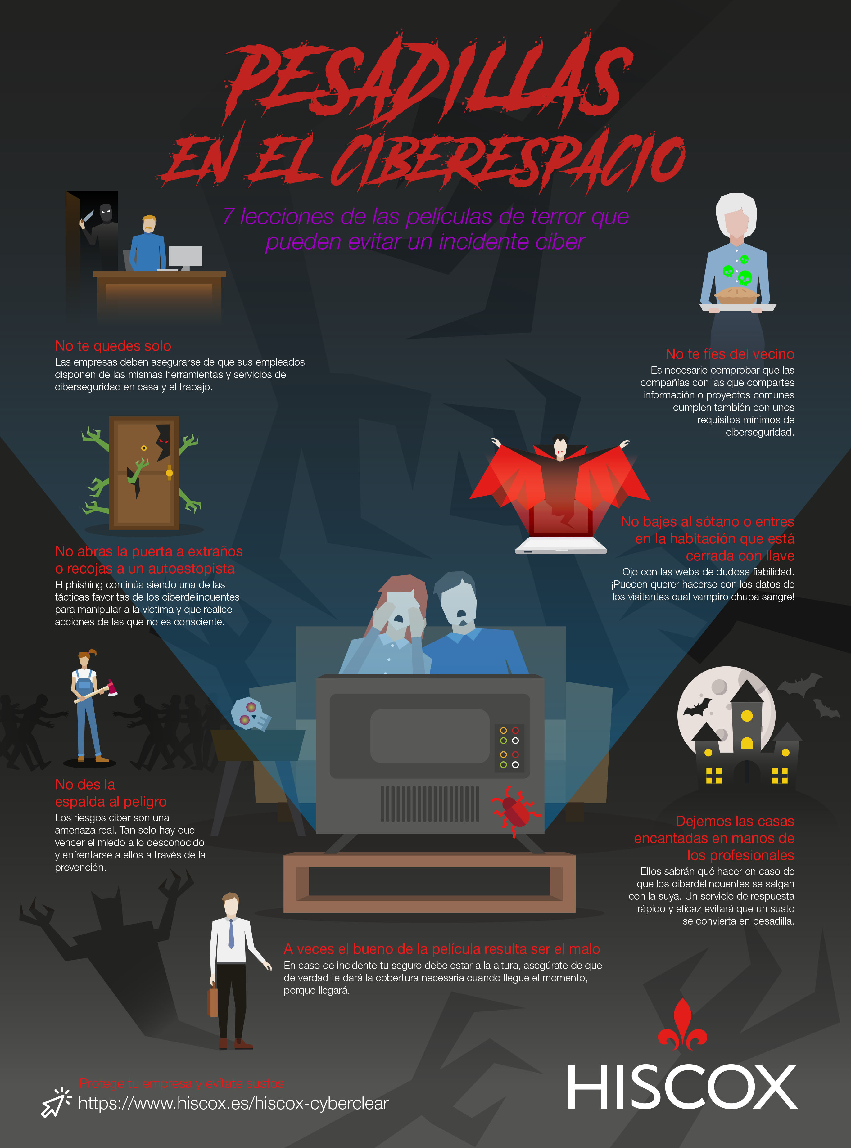 Hiscox quiere sensibilizar de forma didáctica a empresas y profesionales sobre el riesgo de ciberataques y para ello ha preparado la infografía '7 lecciones de las películas de terror que pueden evitar un incidente ciber'.