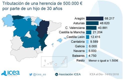 Según los ejemplos de ICEA, para tributar una herencia de 500.000 euros por un hijo de 30 años, en Aragón se pagarían algo más de 68.000 euros, en Asturias cerca de los 49.000 y en la Comunidad Valencia alrededor de 41.000. Estas 3 comunidades son las que cuenta con impuestos más elevados y se sitúan lejos de otras como Madrid, Andalucía o Extremadura.