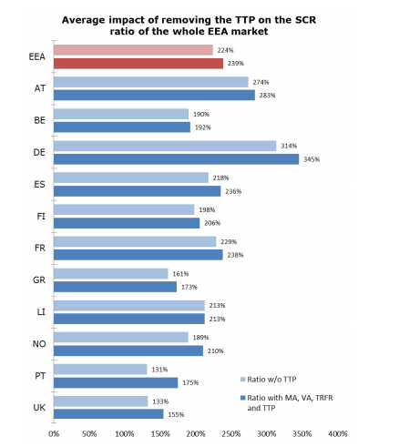 Según la Directiva Solvencia II es posible aplicar la medida transitoria de provisiones técnicas y el matching adjustment, algo que hacen 10 entidades españolas, el 29% de la cuota nacional. En total, la medida transitoria de provisiones técnicas la usan 23 aseguradoras españolas, con un SCR del 262%, que sería del 191% sin aplicar esta medida. Si se tiene en cuenta el mercado en su conjunto (con las entidades que aplican y las que no la medida de provisiones técnicas), el SCR sería del 236%, un 218% si se eliminara esa medida transitoria.