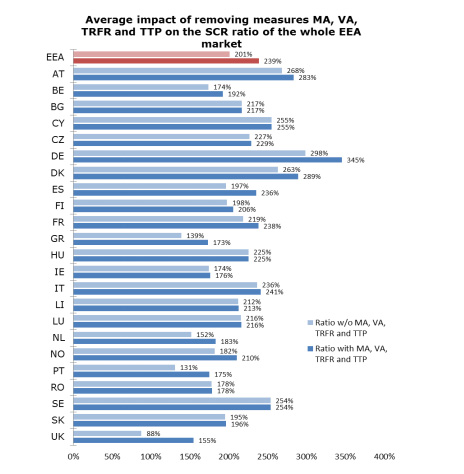 En Europa hay 696 entidades en 23 países que usan el volatility adjustment; 162 entidades en 11 países que utilizan la medida transitoria de provisiones técnicas; 7 en 5 países la medida transitoria de tipos de interés; y 34 en dos países el matching adjustment (ajuste por casamiento). Uno de esos dos países es España (el otro, Reino Unido).