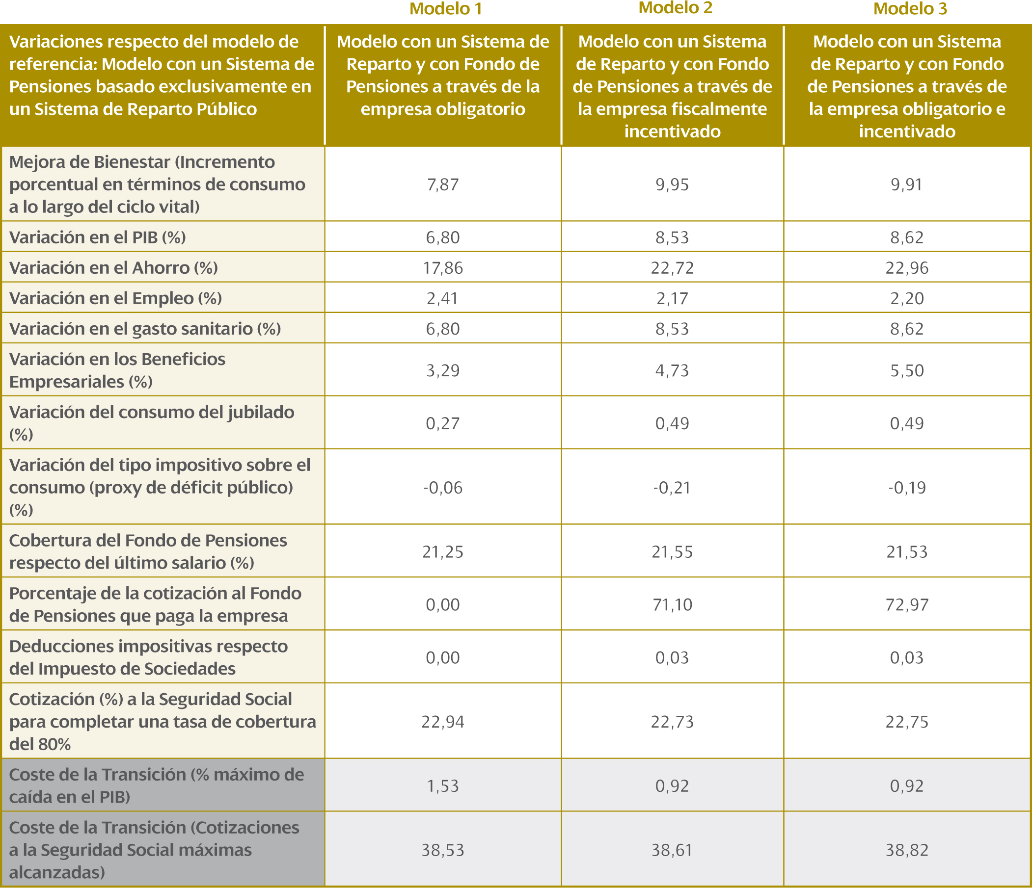 A día de hoy ha sido necesario aplicar medidas correctoras, como el retraso de la edad de jubilación, en aras de mantener el sistema público de pensiones y se prevé que factores como la tasa de sustitución (cuantía de la pensión en relación al último salario) sigan decreciendo. El estudio plantea que para que esta tasa pueda mantenerse en el 80%, bajo el supuesto de que se alcance una estructura demográfica como la esperada para 2050, sería necesario incrementar las cotizaciones del 28,3% actual hasta el 37,4%. En caso de mantener las cotizaciones estables la tasa de sustitución se reduciría al 63,6%. El nuevo modelo, en cambio, permitiría mantener el sistema público sin necesidad de incrementar las cotizaciones o reducir la tasa de sustitución.