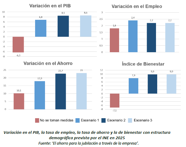 La aplicación de estos cambios, por su profundidad estructural, supondría asumir costes de transición. Sin embargo, retrasar la introducción de medidas que modifiquen el modelo actual o no introducir ninguna, podría suponer una reducción del 6,3% del PIB en el largo plazo, según se explica en el estudio. Introducir medidas que incentiven fiscalmente el ahorro para la jubilación a través de las empresas mejoraría el PIB español en un 8,5%.