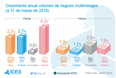 Por modalidades, según los datos de ICEA, el negocio de Industria fue el que más creció en primas (+4,2%) muy por delante de Hogar y Comercio que mejoraron un 2,7% en relación a marzo de 2017. Comunidades incrementa sus primas un 0,8%.