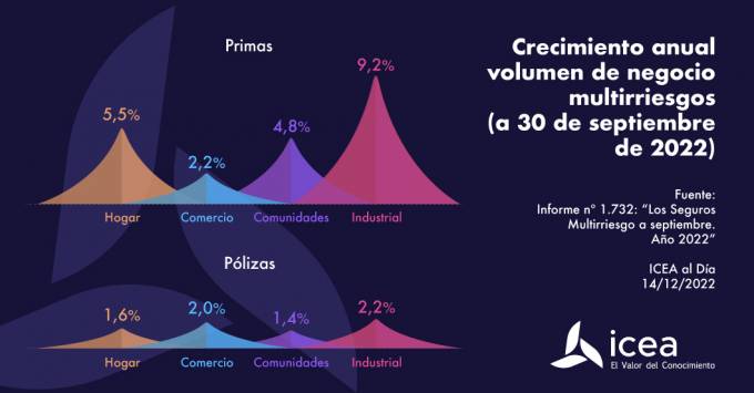 A septiembre de 2022, el ramo de Multirriesgos facturó un volumen de primas de 6.374 millones de euros, lo que supuso un incremento anual del 5,8%. Según datos de ICEA, gran parte de este crecimiento se debe al buen comportamiento de Multirriesgo Industrial, que en los 9 primeros meses del año aumentó un 9,2%. También ha contribuido con creces a la recaudación del ramo la modalidad de Hogar (5,5%). Ya por detrás, pero también en positivo, se sitúan Multirriesgo Comunidades (4,8%) y Multirriesgo Comercio (2,2%).