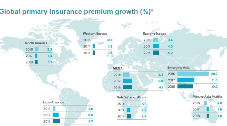 La industria del seguro a nivel global crecerá en 2018. Según Munich Re, la mejoría de las perspectivas económicas en EEUU compensará la disminución del crecimiento del mercado chino. A más largo plazo, la participación en el seguro primario de mercados de gran potencial como el asiático a niveles de los de Europa occidental en los próximos años serán factores determinantes para el crecimiento.