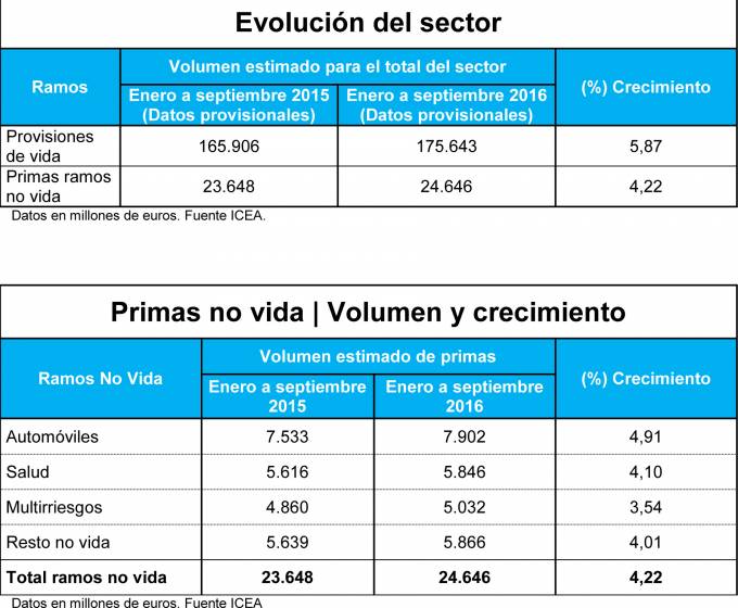Los ingresos de las entidades aseguradoras por la venta de pólizas a cierre del pasado septiembre ascendieron a 47.438 millones de euros, un 14,82% más que un año atrás. De este importe, 24.646 millones de euros correspondieron al ramo de No Vida y los 22.792 millones restantes al de Vida, según muestran los datos provisionales recabados por ICEA y difundidos por Unespa.