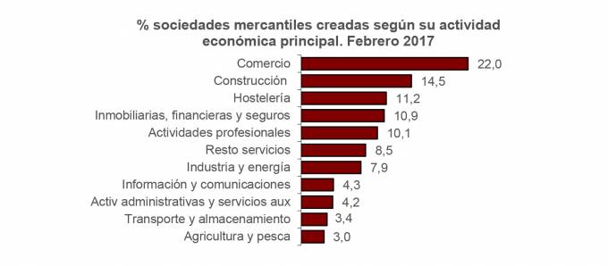Por sectores, el 22% de las sociedades creadas en febrero correspondió a Comercio y el 14,5% a Construcción. El apartado en el que el INE incluye juntas a inmobiliarias, financieras y seguros acaparó el 10,9% de las nuevas empresas, y registraron el 9,8% de las disoluciones. Esas sociedades registraron un capital suscrito de 301.696 millones de euros.