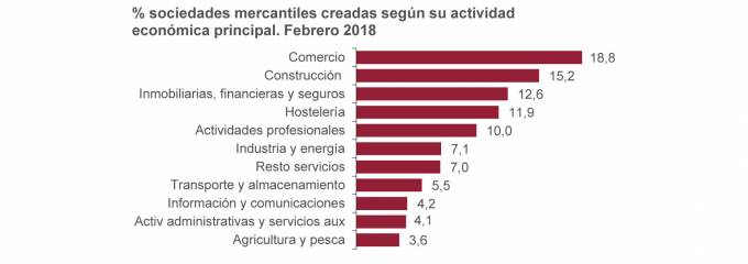 En febrero se crearon 8.747 empresas en España, el 1,1% menos que en el mismo mes del año pasado, mientras el número de disoluciones fue de 2.284, un 1,6% más, según los datos del INE. Por sectores, en el que más empresas se crearon fue del Comercio con el 18,8%. El apartado en el que el INE incluye juntas a inmobiliarias, financieras y seguros acaparó el 12,6% de las nuevas empresas, y registraron el 9,7% de las disoluciones.