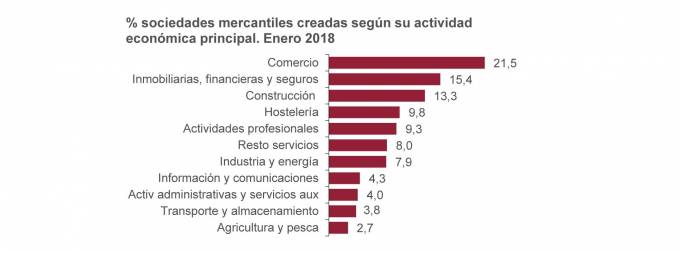 En enero se crearon 9.406 empresas en España, el 5,8% más que en el mismo mes del año pasado, mientras el número de disoluciones fue de 3.708, un 6,9% más, según los datos del INE. Por sectores, en el que más empresas se crearon fue del Comercio con el 21,5%. El apartado en el que el INE incluye juntas a inmobiliarias, financieras y seguros acaparó el 15,4% de las nuevas empresas, y registraron el 10,9% de las disoluciones.