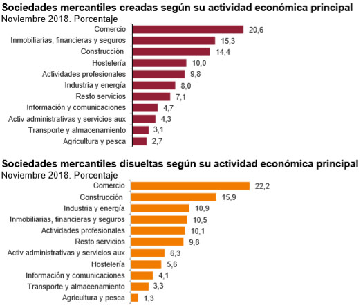 En noviembre de 2018, se crearon 7.974 sociedades mercantiles en España, lo que significa un incremento del 3,3% respecto al mismo periodo del año anterior, y se disolvieron 1.989, nada menos que un 9,9% más, según datos provisionales publicados por el INE.