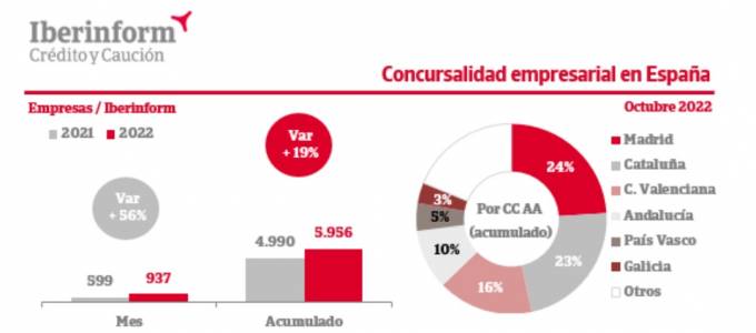 El tejido empresarial español registró en octubre un aumento interanual del 56% de las insolvencias empresariales. En el conjunto del año acumulan un incremento del 19%, según los datos extraídos del BOE por Iberinform.