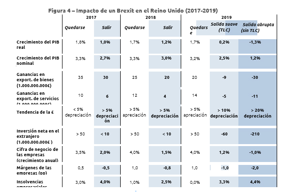 Otras conclusiones del informe es que, según las previsiones, el Reino Unido entraría en recesión a finales del año y su crecimiento caería hasta el 1,3% cuando las previsiones eran del 1,9%. El informe destaca que las negociaciones se dilatarán en el tiempo pero se prevén acuerdos provisionales entre ambas partes.