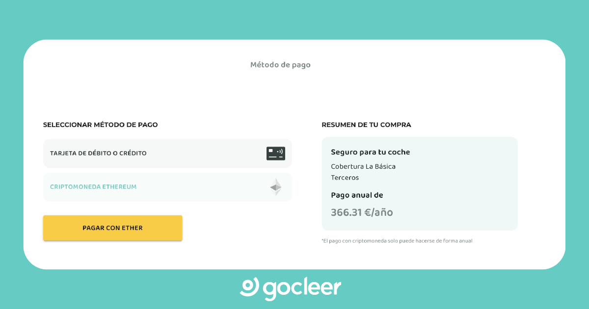 Desde este mes de marzo, los usuarios de Gocleer pueden pagar la prima anual de su seguro de coche, bici, moto o patinete en esta criptodivisa. Antes de finalizar el proceso de contratación online, en la pasarela de pago, el usuario puede elegir entre abonar la cuantía a través de una tarjeta de débito, de crédito o en la criptomoneda de Ethereum.